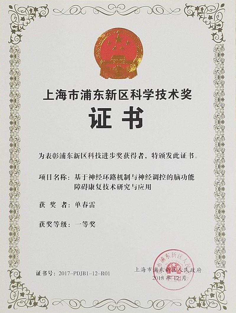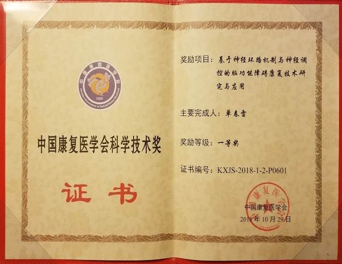2018年分别获得中国康复医学会科学技术奖一等奖及上海市浦东新区科技进步奖一等奖,该成果是发挥认知神经科学、康复医学和临床医学学历背景优势,利用脑成像技术了解功能障碍的神经环路机制,采用基于特定神经环路机制的训练方法及神经调控技术,使脑功能康复变得精准和有针对性,突破了常规康复方法的疗效瓶颈,在国内外康复医学界起到示范和引领作用。