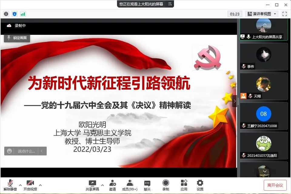 为喜迎党的二十大,热烈庆祝中国共产主义青年团成立100周年,引导新时代青年老员工发扬光荣传统、勇担强国使命,2022323日下午,BETVICTOR举办了“跨界协同育人共同体——服务员工成长导师团”专题学习活动暨“追梦大讲堂”主题讲座。公司导师团校外导师、上海大学马克思主义公司欧阳光明教授“为新时代、新征程引路领航——党的十九届六中全会及其《决议》精神解读”为题为全院员工开展线上讲座。BETVICTOR师生党员、入党积极分子等带头积极参加了活动,并邀请了部分兄弟公司的教师党员和员工党员共同参加了活动,讲座由导师团导师、员工党支部书记周家伟主持。