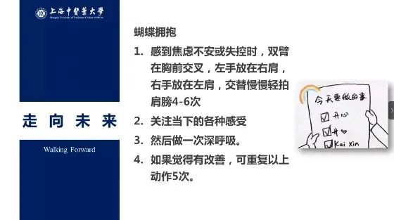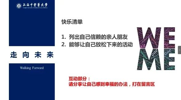 她从心理学视角探讨了目前员工们热议的“摆烂”、“躺平”等生活态度,并通过互动指出,只要有足够的心智化,人可以成为解决自己难题的专家。最后,她向同学们教授了“天气预报”、“左手右手”、“快乐清单”、“蝴蝶拥抱”等调节心情的方法。