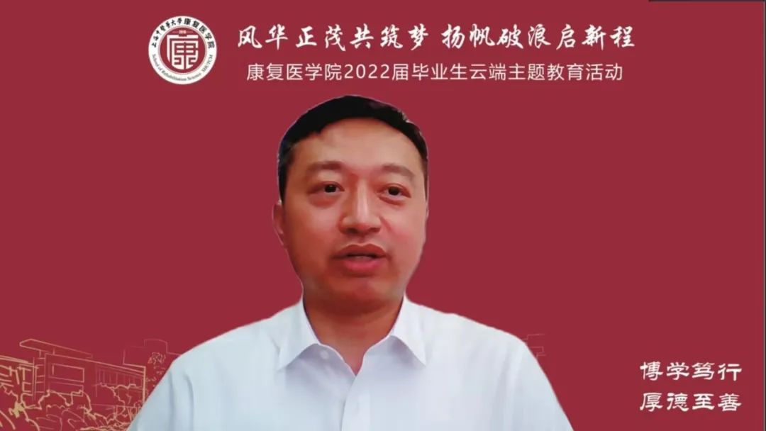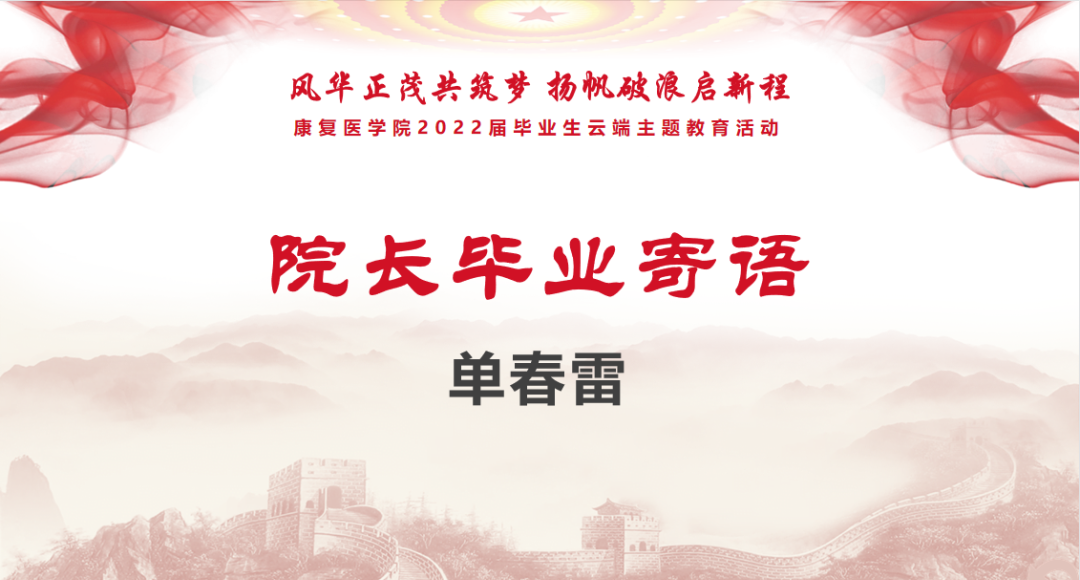 单春雷《铭记医者仁心,勇担康复使命》为题向2022届全体毕业生寄语。他向学有所成的康复学子们表示祝贺,鼓励同学们牢固树立科学精神、熟练掌握科技知识、着力提升人文素养、耐心打磨沟通技巧,早日成长为康复医学的骨干、社会发展的栋梁、民族复兴的脊梁,用仁爱的心、温情的眼、智慧的手帮助病人和社会,用责任担当助力中华民族伟大复兴。