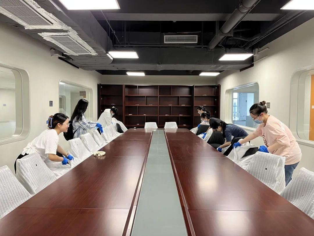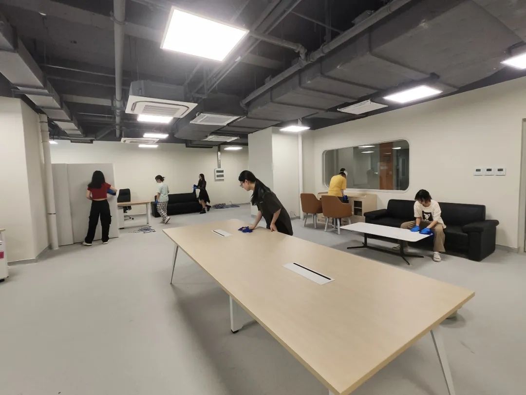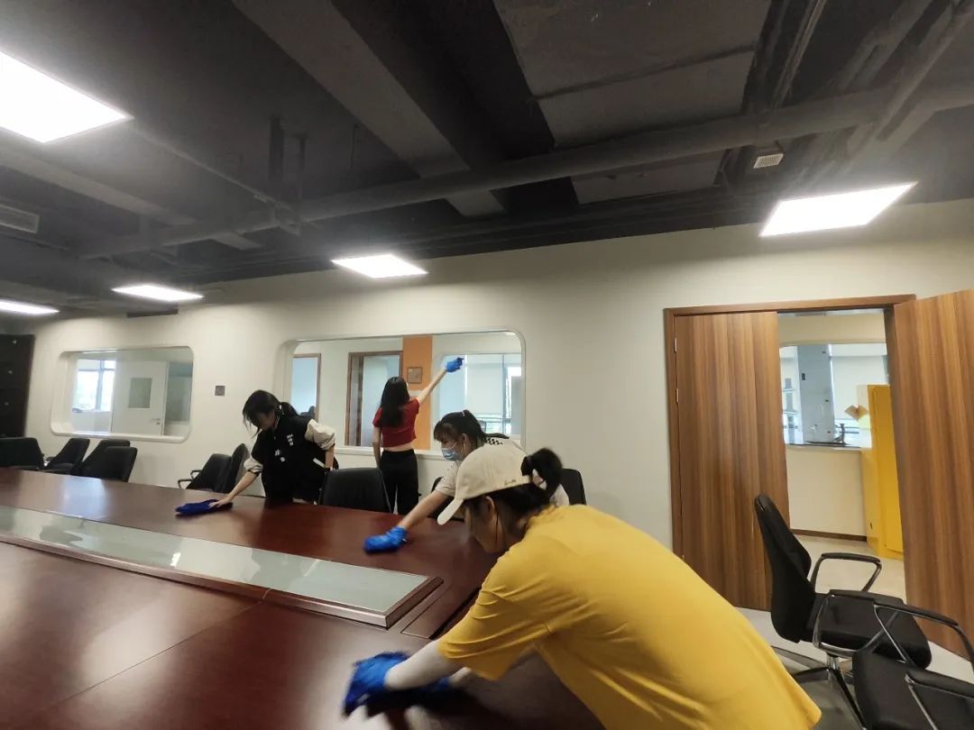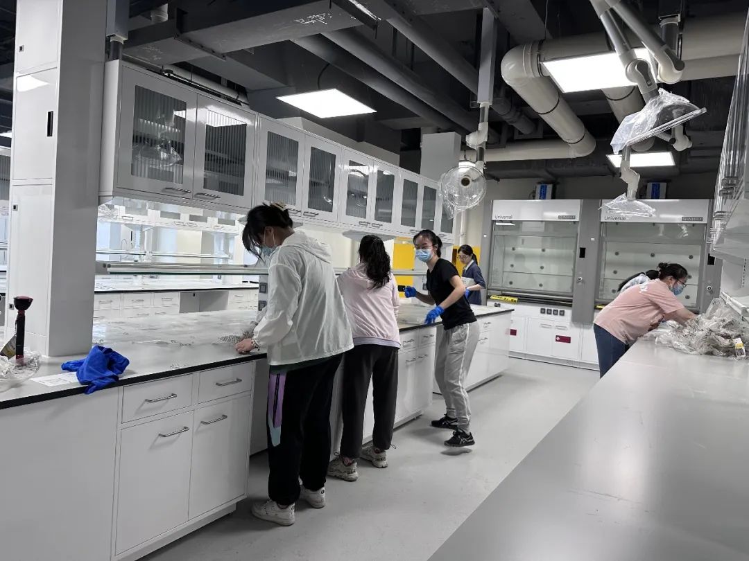 在辅导员老师的组织下,30名2022级本科生手持各式劳动工具干劲满满的来到亟待整理的办公区域。经过高效的现场协调和任务分配,同学们拿着扫帚、拖把、抹布分小组前往各办公室打扫起来。拆卸各类办公设备的外包装,擦拭桌子、椅子、储物柜、通风柜、试验台,清理残留在窗台和旮旯的杂物……同学们洗布换水脚步不停,进进出出热火朝天。虽然动辄三个小时的密集劳动着实让身体疲惫,但看到焕然一新的实验室和办公室,同学们的心中不禁涌现出一股自豪感,也更加理解了保洁阿姨们日常工作的艰辛,懂得了舒适洁净的校园环境来之不易。劳动教育结束之后,同学们在老师的带领下参观了中医药国际标准化研究中心大楼,进一步增进了对中医药国际化事业发展的具体了解。