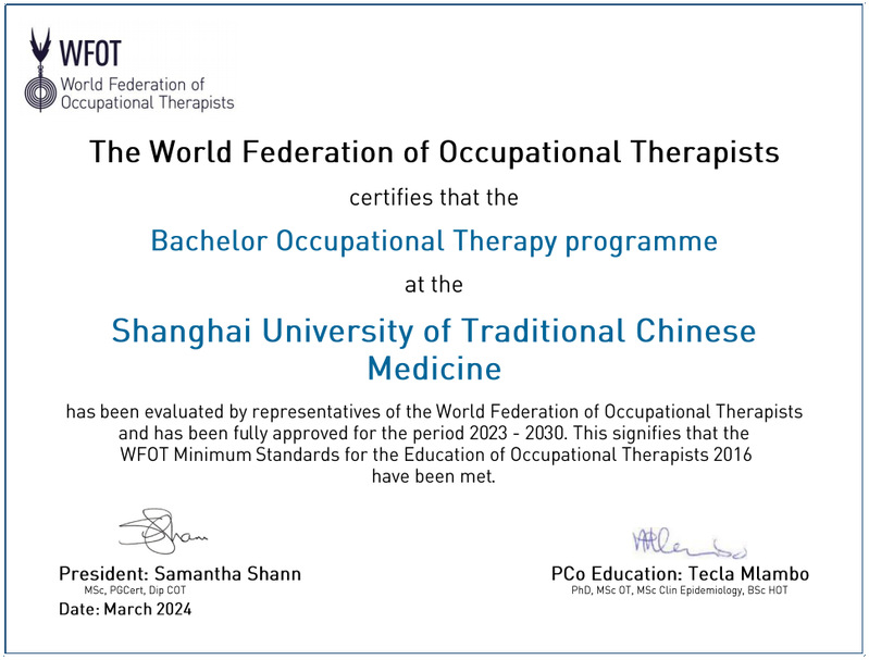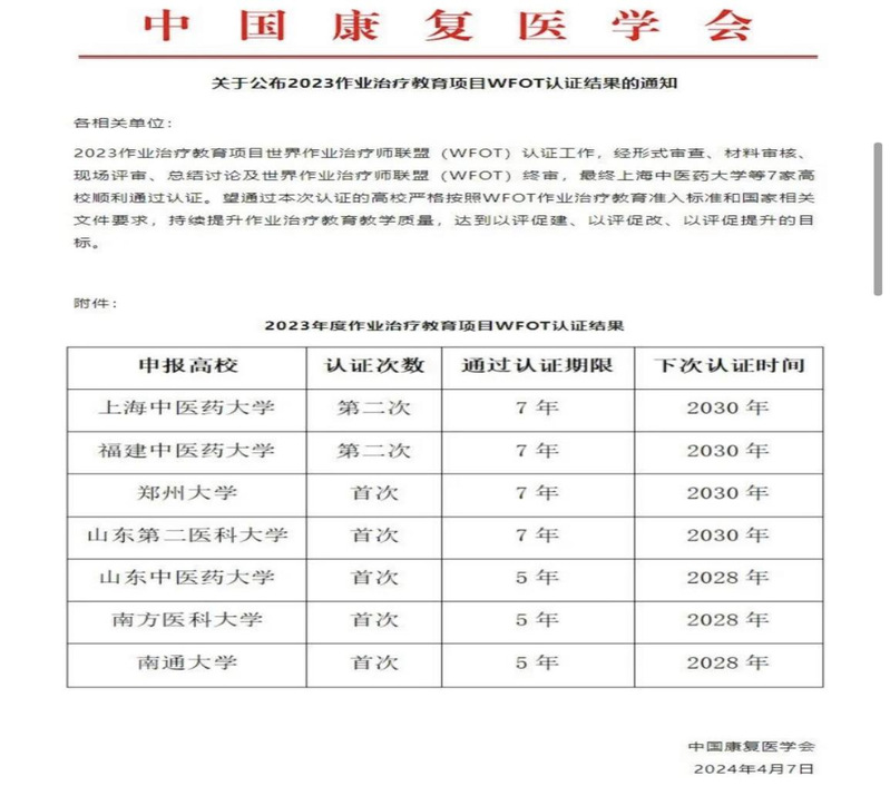 近日,BETVICTOR康复作业治疗专业教育通过世界作业治疗师联盟(The World Federation of Occupational Therapists, WFOT)复审认证,获得了7年最高级别有效认证期。