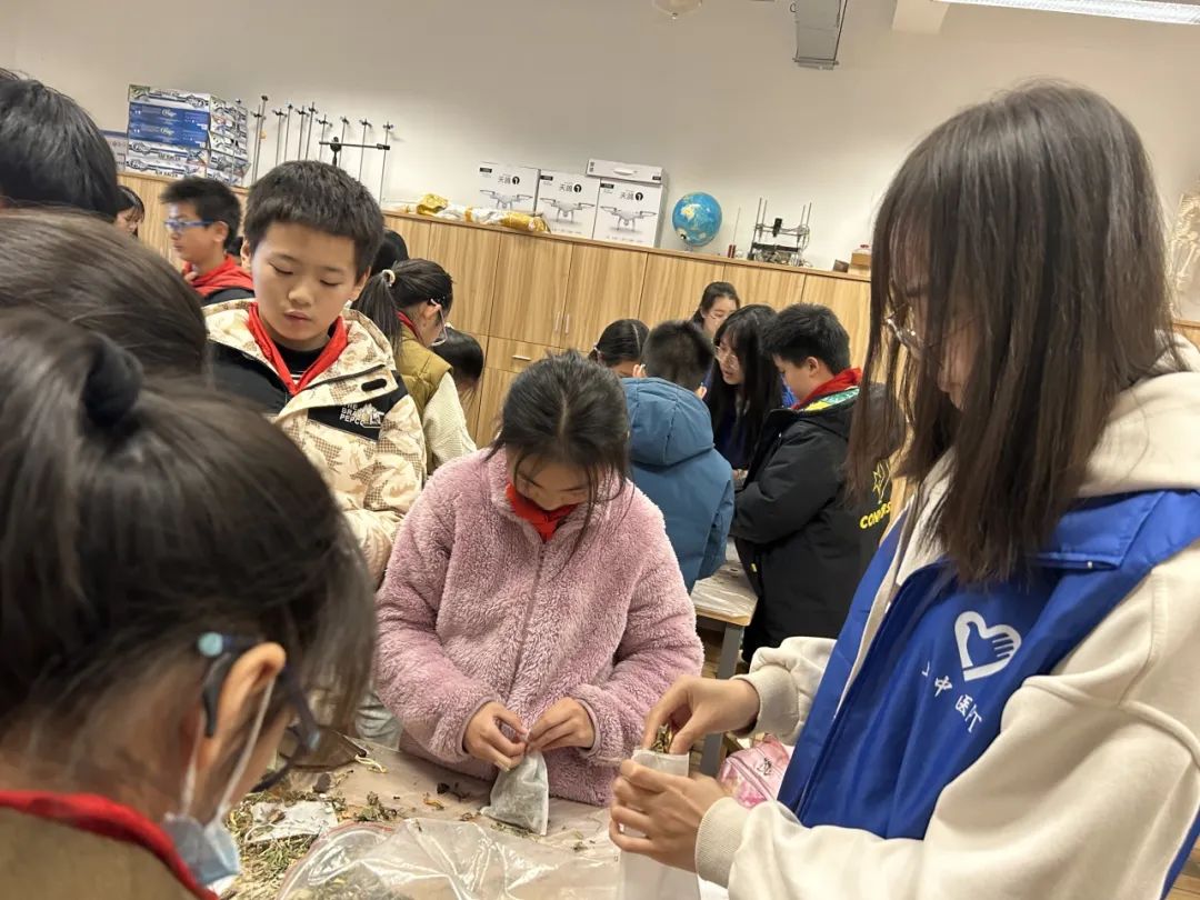 今天是春分,太阳直射赤道,昼夜等长,天气温暖、阳光明媚。很荣幸在这样的平凡日子里,闻着草药的清香,协助小朋友制作香囊。艾叶、丁香、薄荷、藿香、佩兰、陈皮相互配合,防蚊驱虫,老员工志愿者和五年级小朋友,大手拉小手,共同感受中药的魅力。习近平总书记指出,“只有全面深入了解中华文明的历史,才能更有效地推动中华优秀传统文化创造性转化、创新性发展。”中医药文化是中医药事业发展的根基与灵魂,孩子们从小就接触感受中医药,有利于发扬我们的文化自信。孩子们活动中表现出来的坚韧、睿智,让我切身体会到了什么叫“长江后浪推前浪”,10后的小孩哥、小孩姐如此优秀,我们00后也得加油啊。