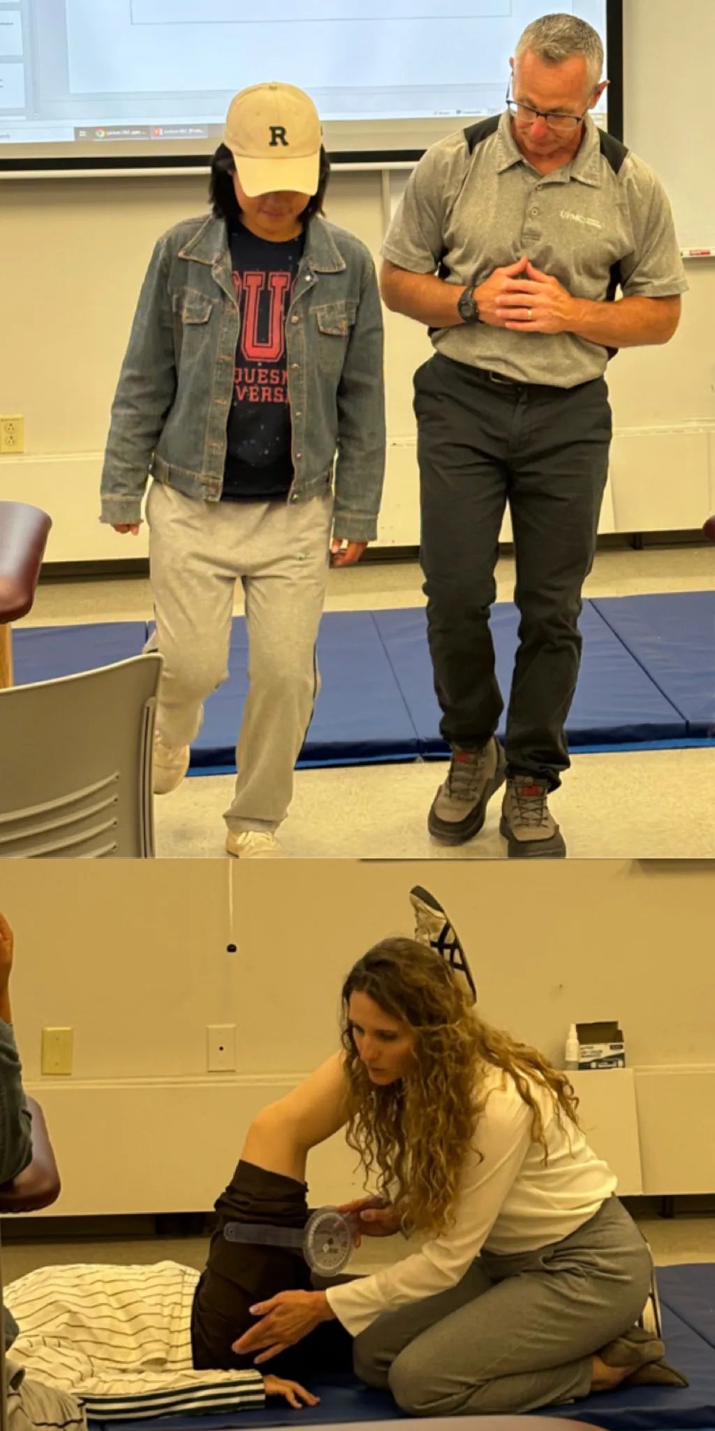 Martin教授通过模仿和演练患者的异常步态,如跛行、跨阈步态画圈步态等,让员工自行分析异常步态的潜在原因,学习如何进行康复训练,以帮助患者恢复正常步态。