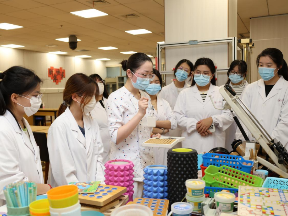 在作业治疗区,治疗师为同学们展示了智能康复训练设备,通过打地鼠抓蝴蝶等趣味游戏提升他们的训练积极性,锻炼患者的上肢功能。参观中,同学们也体会了作业治疗师所要具备的创造力,通过设计贴近生活的治疗内容和巧妙的工具改造,让病人通过作业治疗能够再次完成他们想要做的事情,提高他们的日常生活活动能力,重新找回生活的自主感,开启新生。