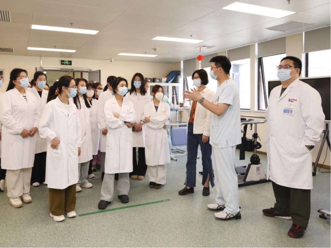 同学们在参观过程中了解到了早期康复的理念,比如通过在同楼层病区设置康复治疗厅、在ICU开展早期康复训练,让患者在情况稳定后可以尽早接受康复训练和作业治疗,以减少并发症,促进患者康复。祝老师提到康复介入ICU康复时,要时刻留意仪器上的参数监测,时刻掌握患者的情况,让同学们感受到了在ICU开展康复训练与其他科室的不同和挑战。