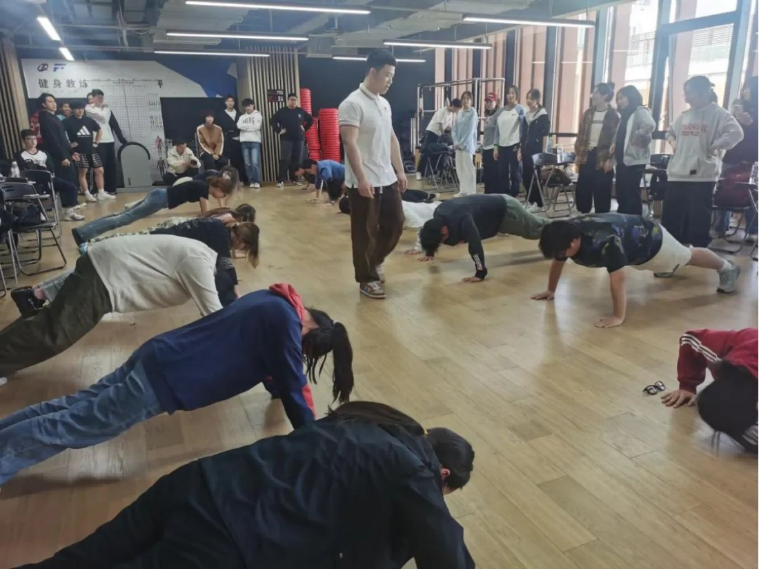接着,两位教练对标初级教练入门体能要求标准,安排同学们分组体验1.5倍肩距俯卧撑、标准深蹲及坐姿体前屈测试。几个简单的测试任务,同学们的体能水平高低立现,经常泡健身房的同学明显轻松胜任,也有个别同学气已经体力不支。教练鼓励同学们平时只要多去健身房,一定都能达到初级教练体能要求。